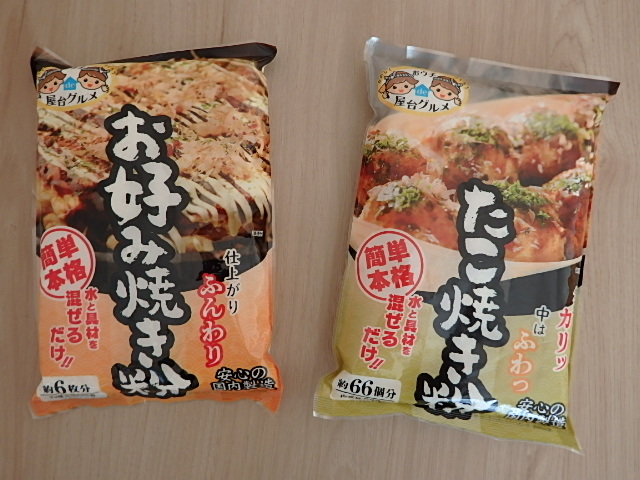 ダイソーで販売されている「お好み焼き粉」と「たこ焼き粉」は成分や内容量、値段は変わらないので、どちらを購入しても大丈夫です。(今回はお好み焼き粉を使用しています)