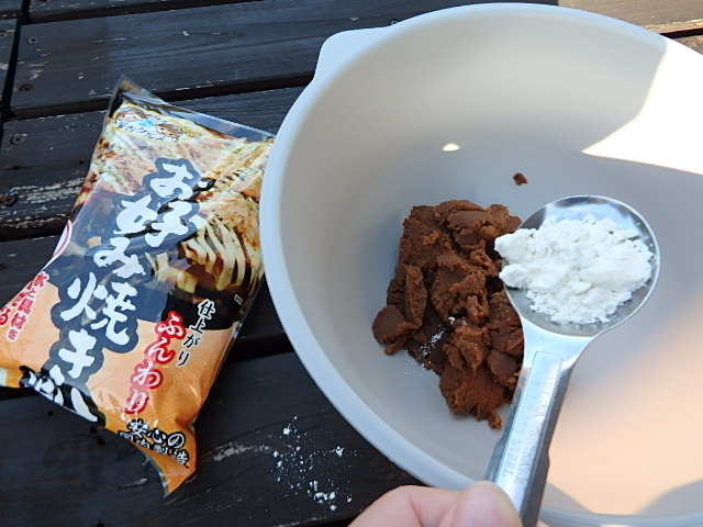 比率としてはアミエビ(250g)と同量くらいのお好み焼き粉(200~250g)から混ぜ合わせていきます。