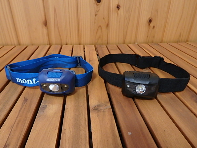 左側がモンベルのヘッドライト。右側がダイソーモーションセンサー付きヘッドライトです。