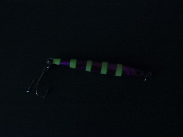 夜光塗料が塗られていて、暗い中でも魚にアピールできます。グロー系のジグを使うなら、投げる前に必ずライトで数秒照らし、蓄光させてから投げましょう。