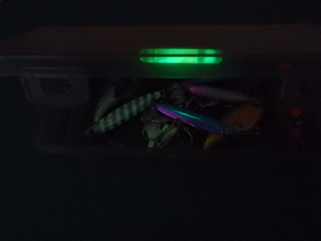小物入れにケミカルライトを付けておくと、暗い場所でも「どこに何があるか」がすぐに分かるので、手元の安全と紛失防止として、夜釣りには便利なアイテムとなります。