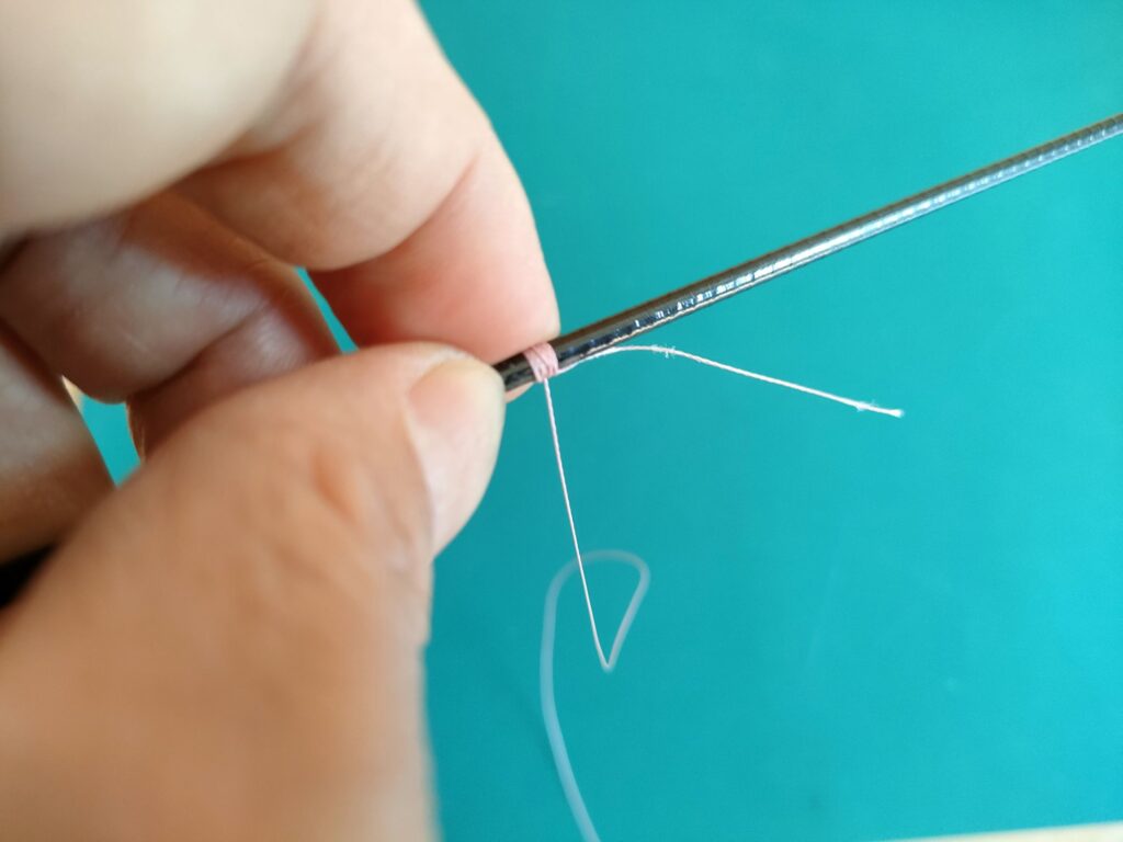 - 抜き取り用の輪っかの中にカットした部分のスレッドを通していきます。
