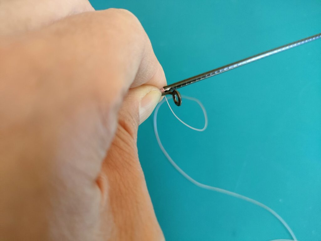 - スレッドをガイドに巻き切る前に、事前に用意した「抜き取り用のPEラインの輪っか」を乗せます。
