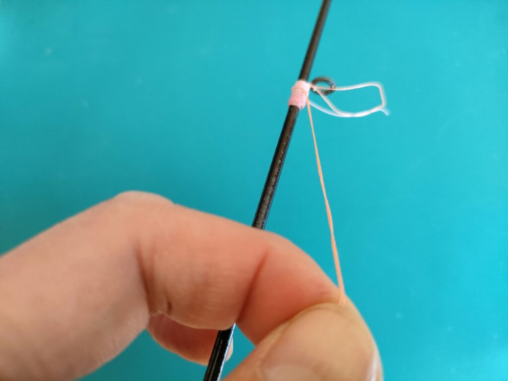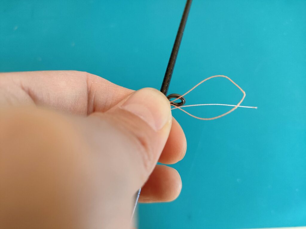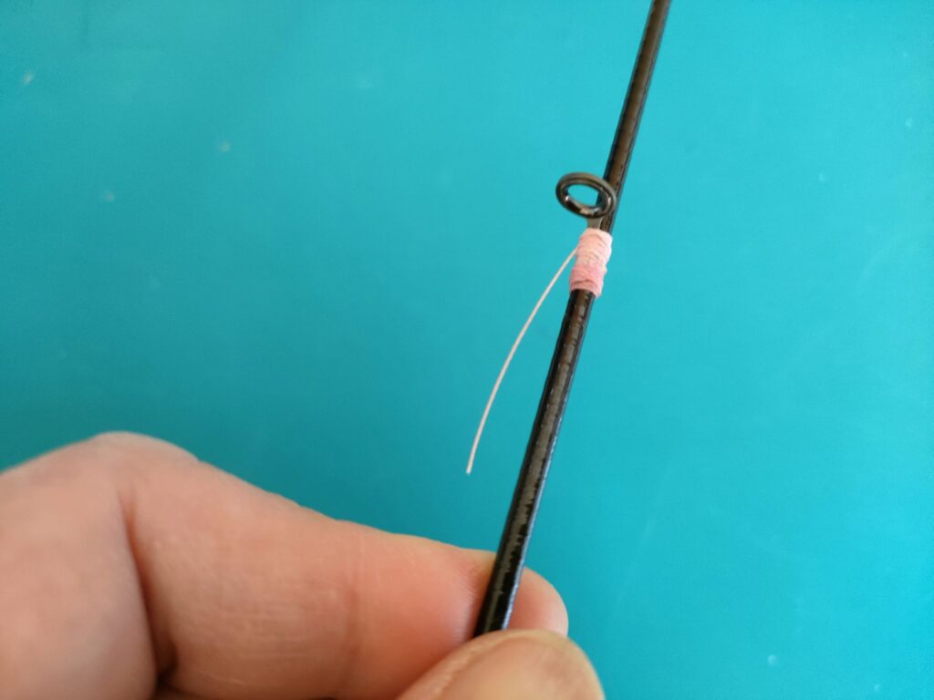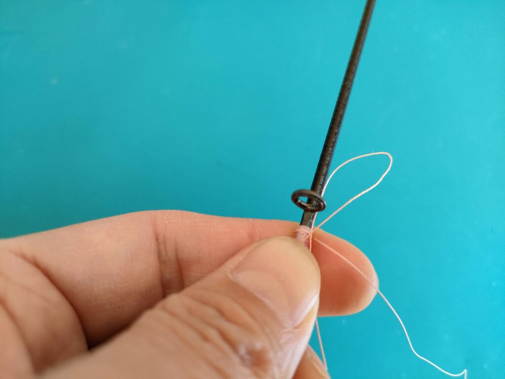 - 輪っかの上から、さらにスレッドをガイドの根元まで巻いていきます。