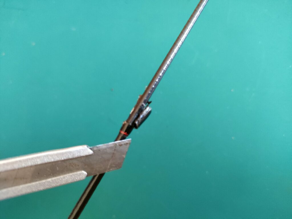 - カッターを入れる際は、竿の上ではなく、必ずガイドの金属の足の上に刃を当ててください。金属の上なら、多少力が入っても竿本体を削る心配がありません。