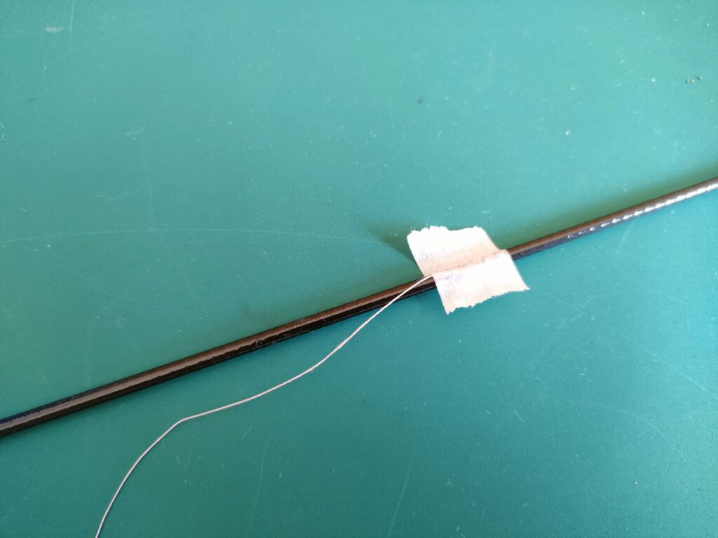 - スレッドをマスキングテープで仮止めします。今回はPEラインをスレッドの代わりに使用しています。