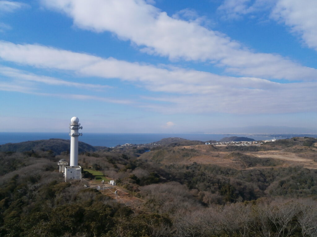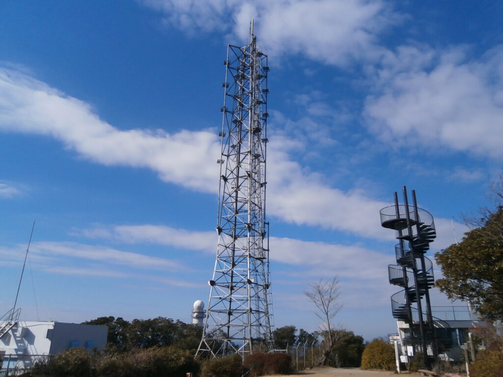 遠くからでも目立つ、山頂付近の「白い塔」は「大楠山レーダ雨量観測所」という施設のようです。灯台のような、独特のドーム型をしており、大楠山のシンボル的な存在になっています。