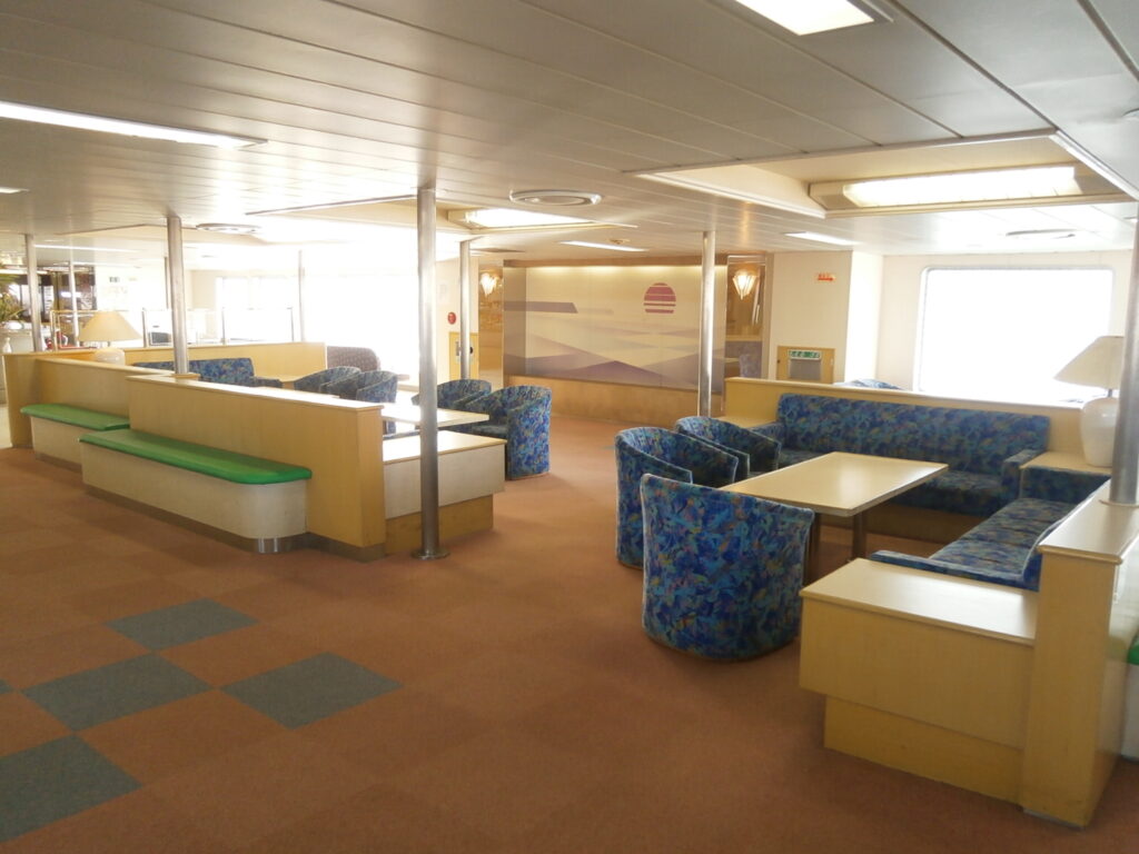 ホテルのラウンジのような船内です。船内には海を望むシートや軽食を販売する売店があり、ちょっとしたクルーズ気分が味わえます。