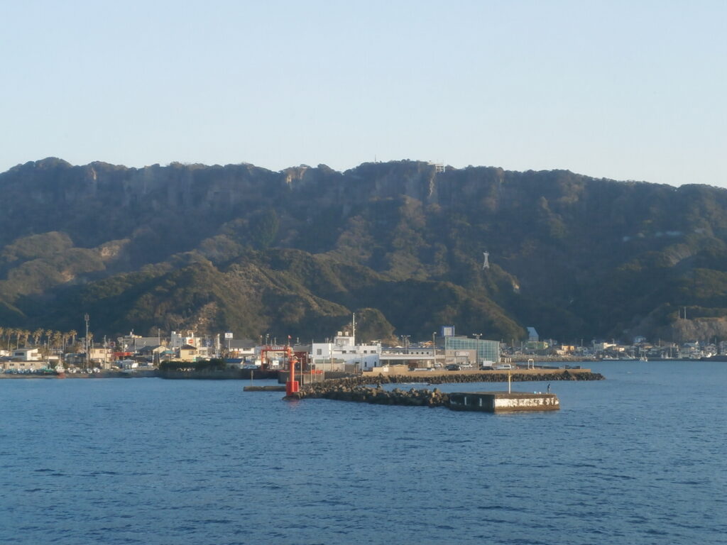 千葉の名峰「鋸山」が見えてきました。かつて「房州石」の採石場だったため、ノコギリの歯のようにギザギザとした稜線が特徴的な山です。